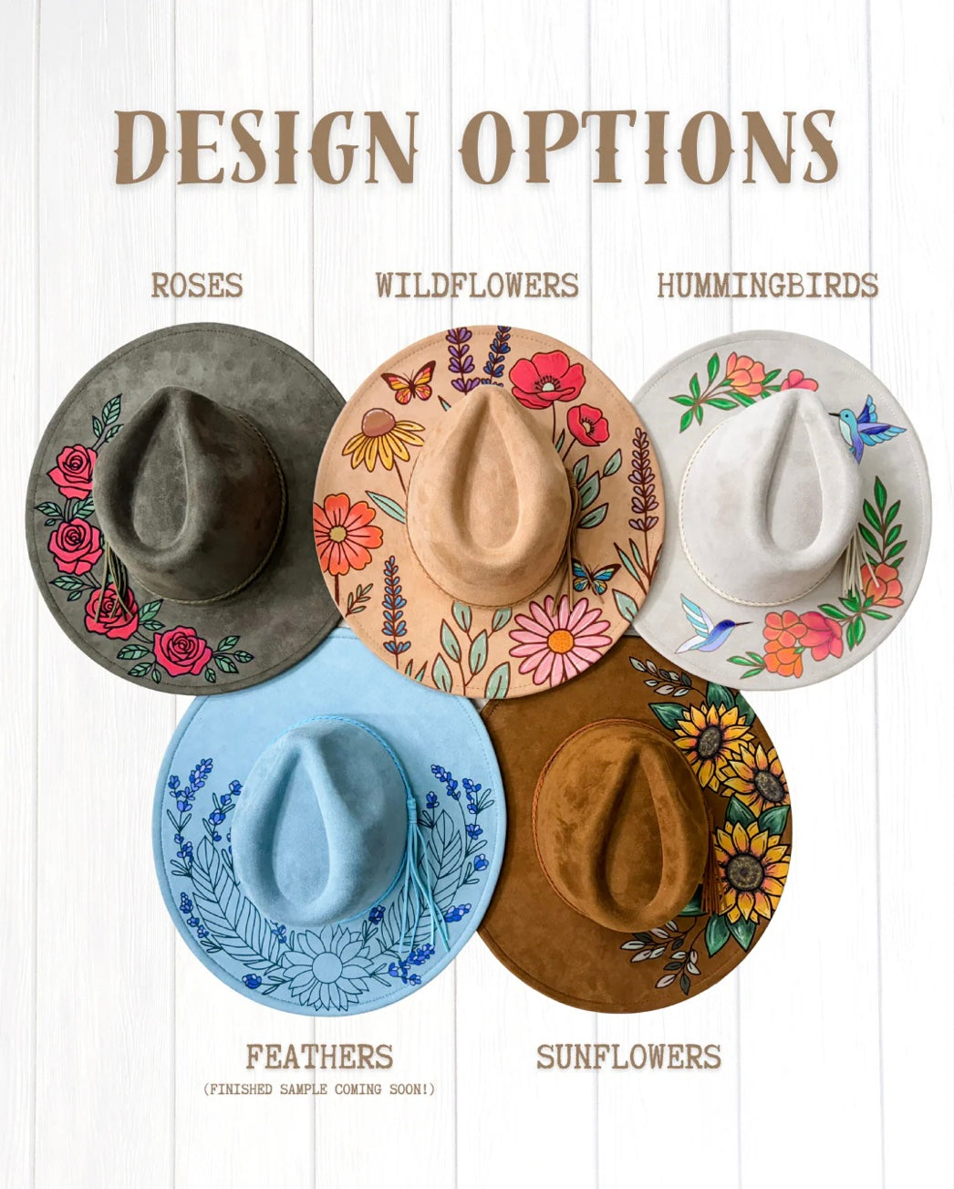 Make your mark on this wide-brim vegan suede hat! Pick your perfect color and custom engraved design, then unleash your creativity with paint and embellishments. With an adjustable fit for head sizes 56-58cm, this comfy, versatile hat is your blank canvas waiting to become a one-of-a-kind masterpiece.
